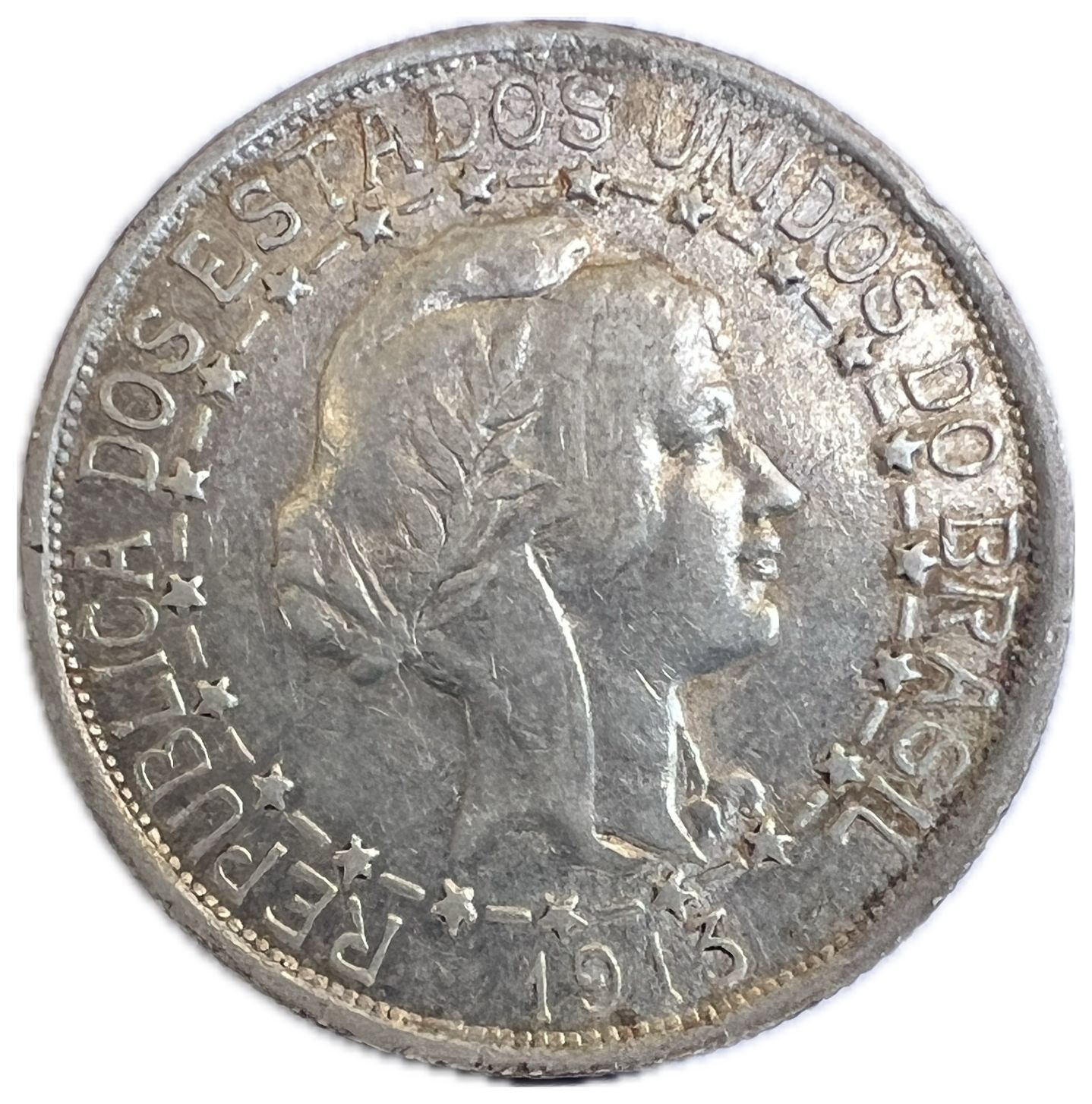 Anverso: REPUBLICA DOS ESTADOS UNIDOS DO BRASIL / Cabeça de mulher voltado à direita, representando a República do Brasil, dentro de colar de 21 estrelas ligadas, representando a união dos estados / DATA
