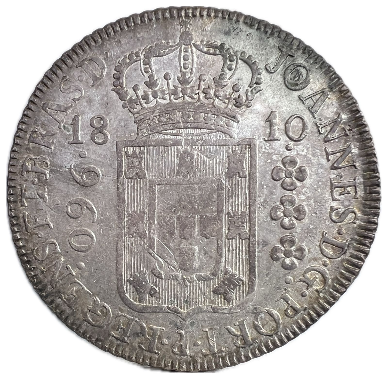 Anverso: JOANNES . D . G . PORT . P . REGENS . ET . BRAS . D . Escudo encimado por coroa, ladeado à esquerda por valor entre pontos e à direita 3 florões verticais entre pontos; data