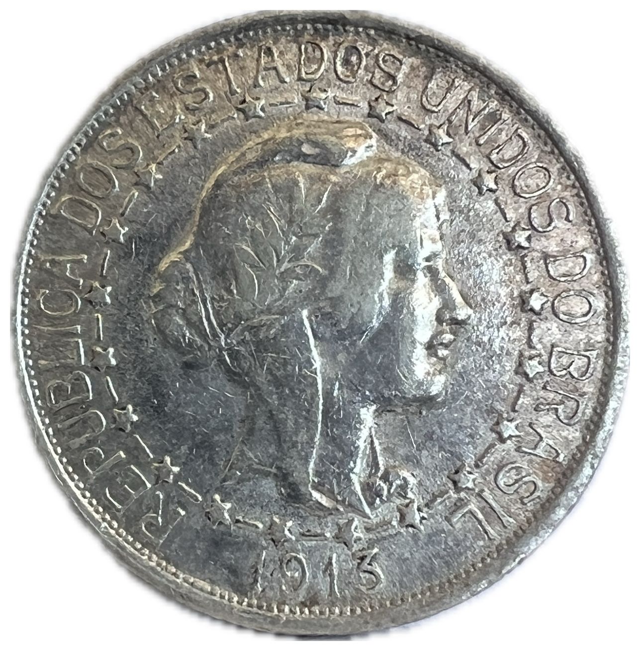 Anverso: REPUBLICA DOS ESTADOS UNIDOS DO BRASIL / Cabeça de mulher voltado à direita, representando a República do Brasil, dentro de colar de 21 estrelas ligadas, representando a união dos estados / DATA