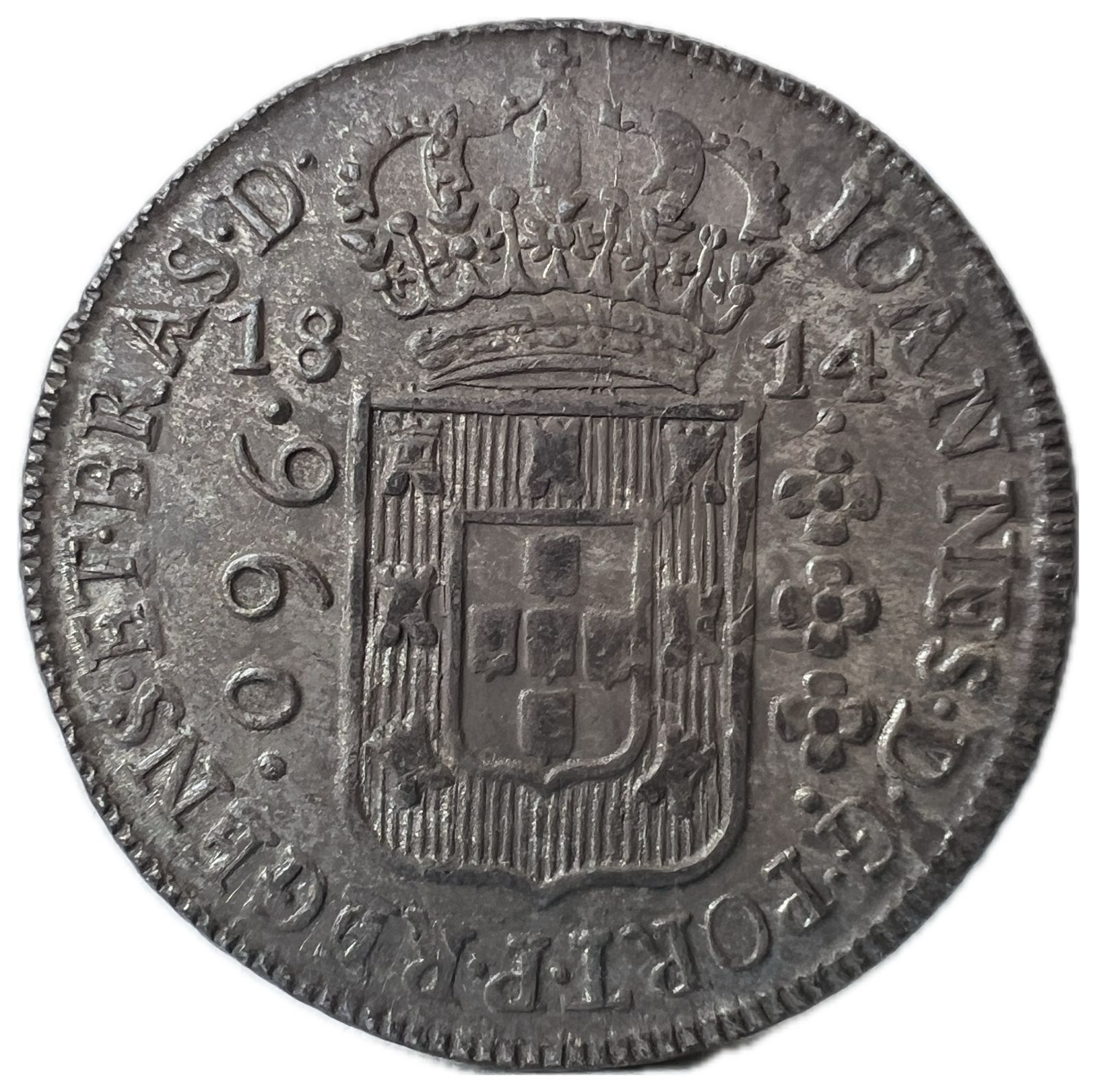 Anverso: JOANNES . D . G . PORT . P . REGENS . ET . BRAS . D . Escudo encimado por coroa, ladeado à esquerda por valor entre pontos e à direita 3 florões verticais entre pontos; data