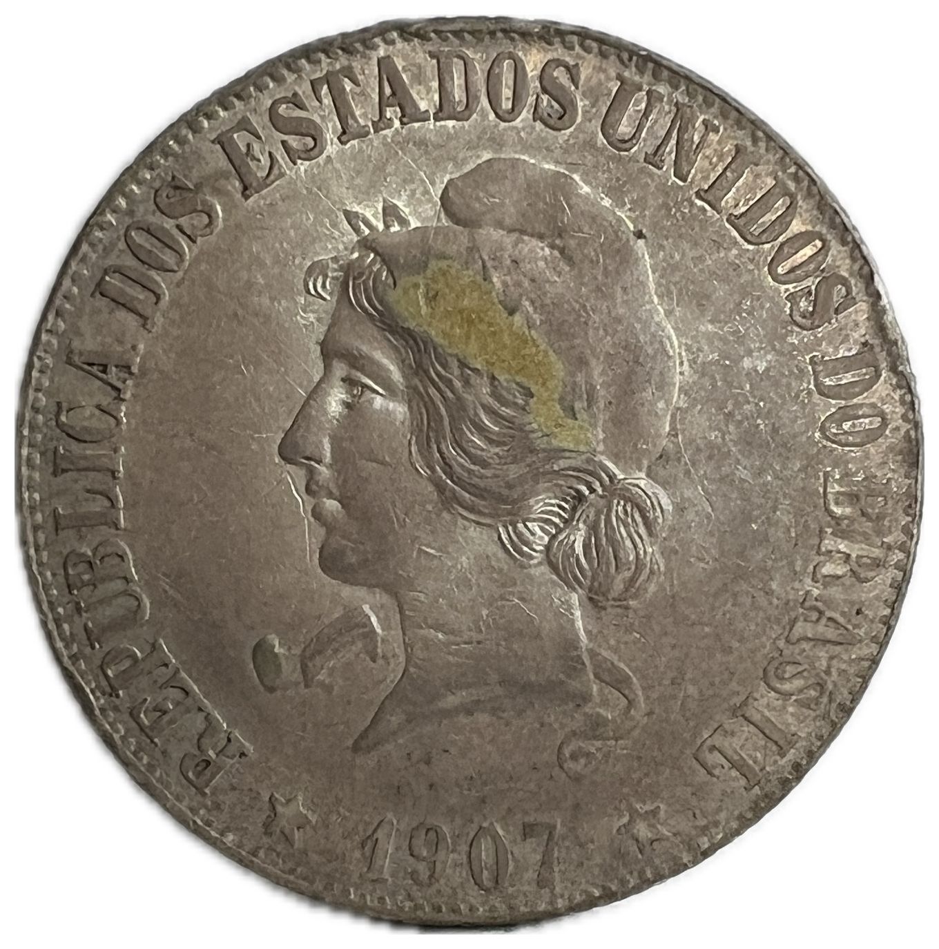 Anverso: REPUBLICA DOS ESTADOS UNIDOS DO BRASIL / Cabeça de mulher com barrete frígio voltada à esquerda, personificando a liberdade e a República do Brasil. Data entre estrelas