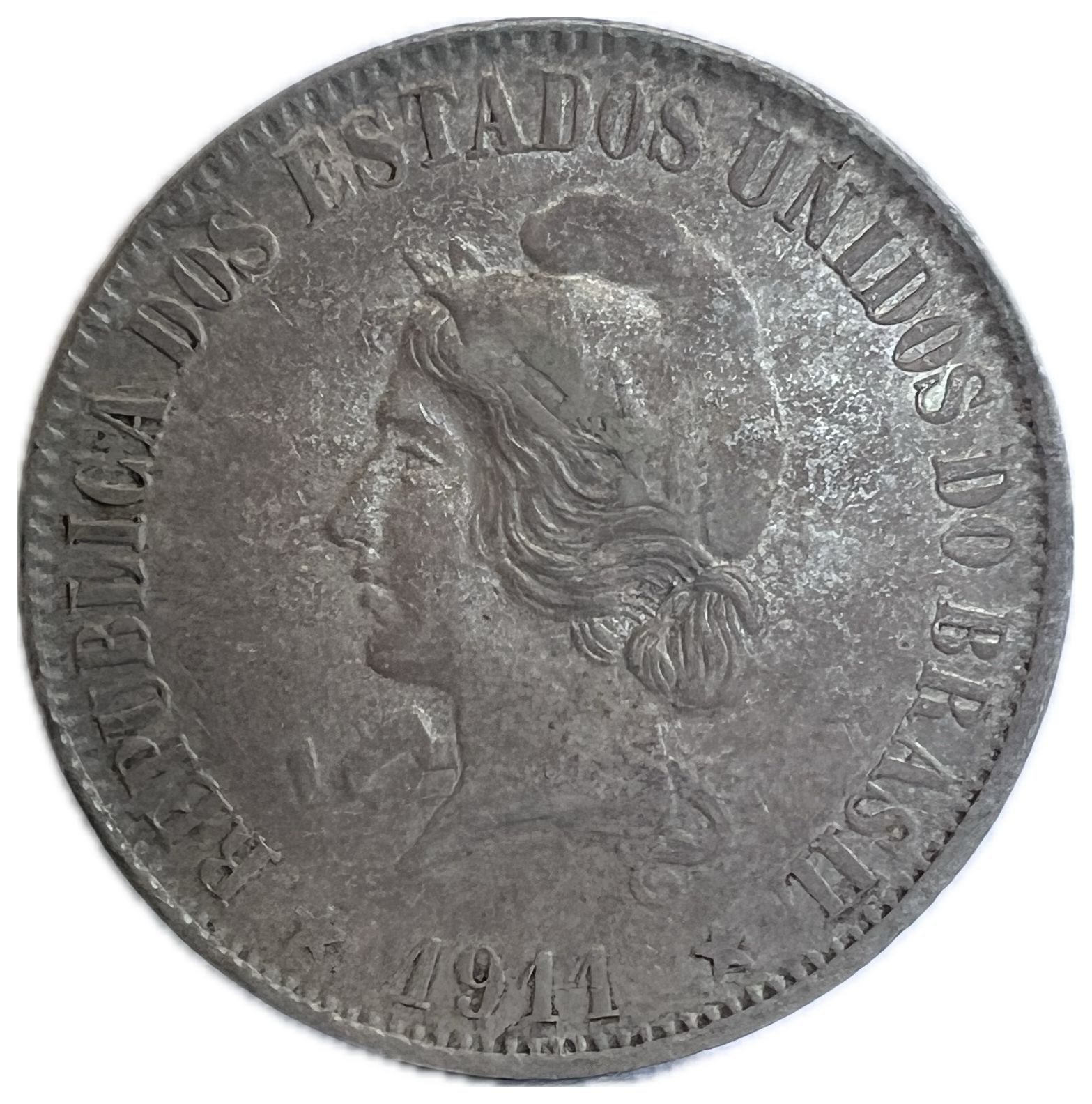 Anverso: REPUBLICA DOS ESTADOS UNIDOS DO BRASIL / Cabeça de mulher com barrete frígio voltada à esquerda, personificando a liberdade e a República do Brasil. Data entre estrelas