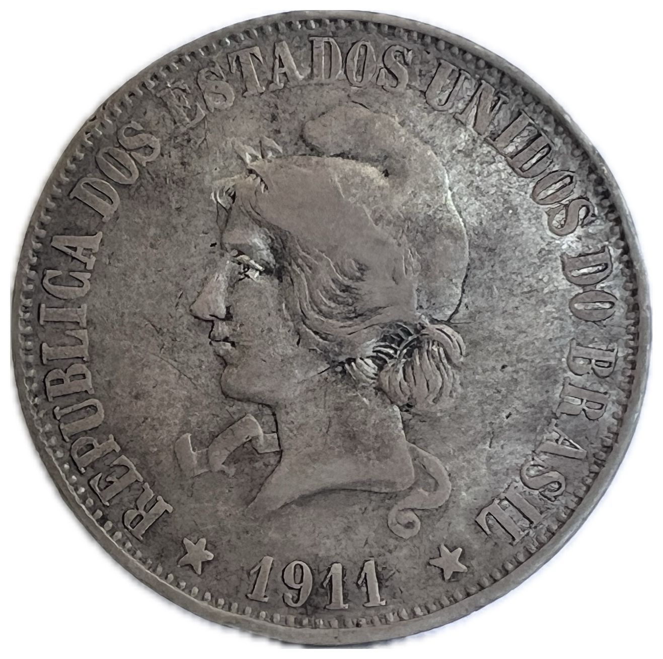 Anverso: REPUBLICA DOS ESTADOS UNIDOS DO BRASIL / Cabeça de mulher com barrete frígio voltada à esquerda, personificando a liberdade e a República do Brasil. Data entre estrelas