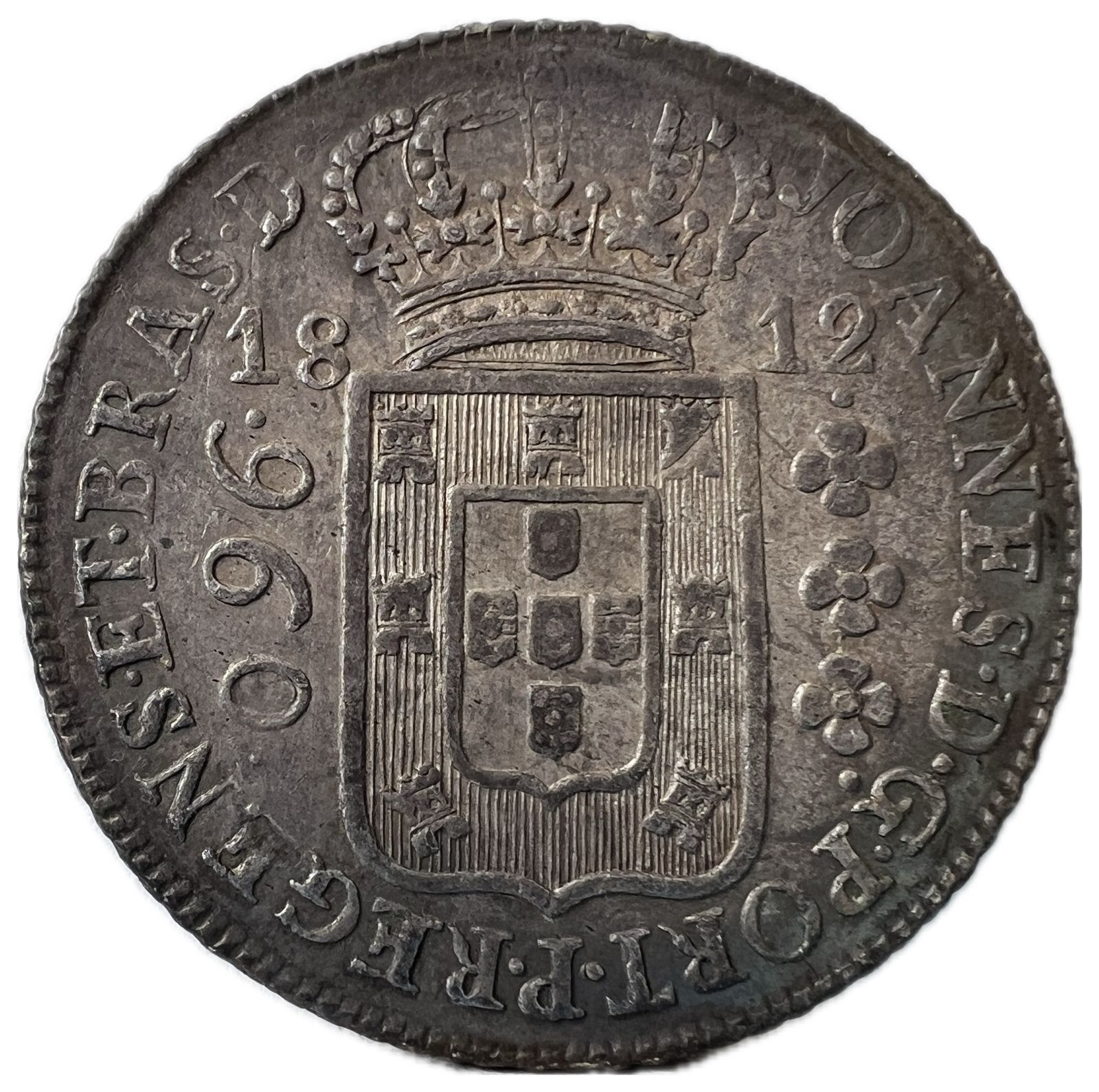 Anverso: JOANNES . D . G . PORT . P . REGENS . ET . BRAS . D . Escudo encimado por coroa, ladeado à esquerda por valor entre pontos e à direita 3 florões verticais entre pontos; data