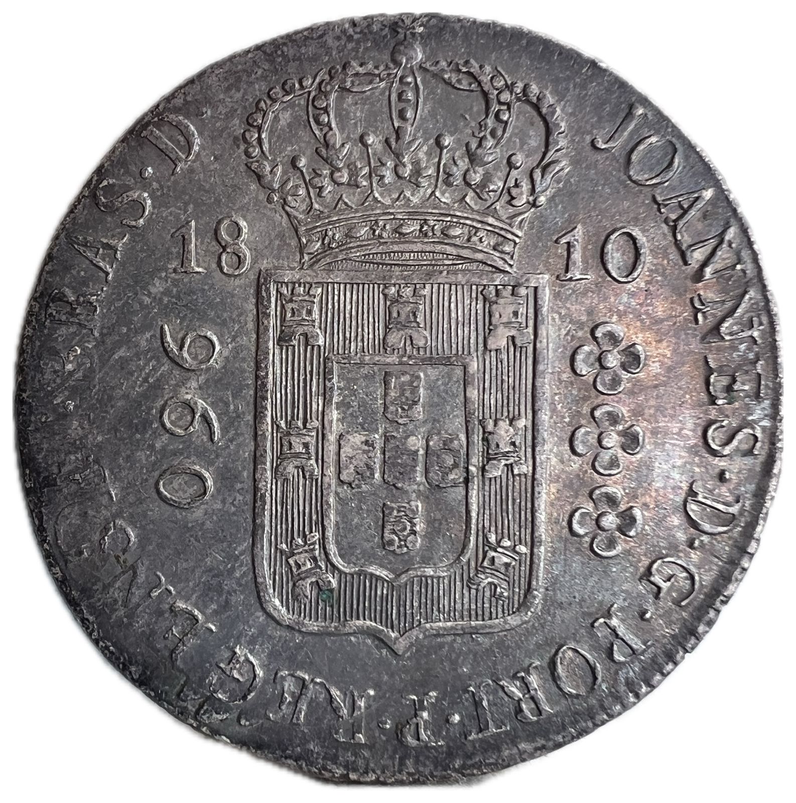Anverso: JOANNES . D . G . PORT . P . REGENS . ET . BRAS . D . Escudo encimado por coroa, ladeado à esquerda por valor entre pontos e à direita 3 florões verticais entre pontos; data