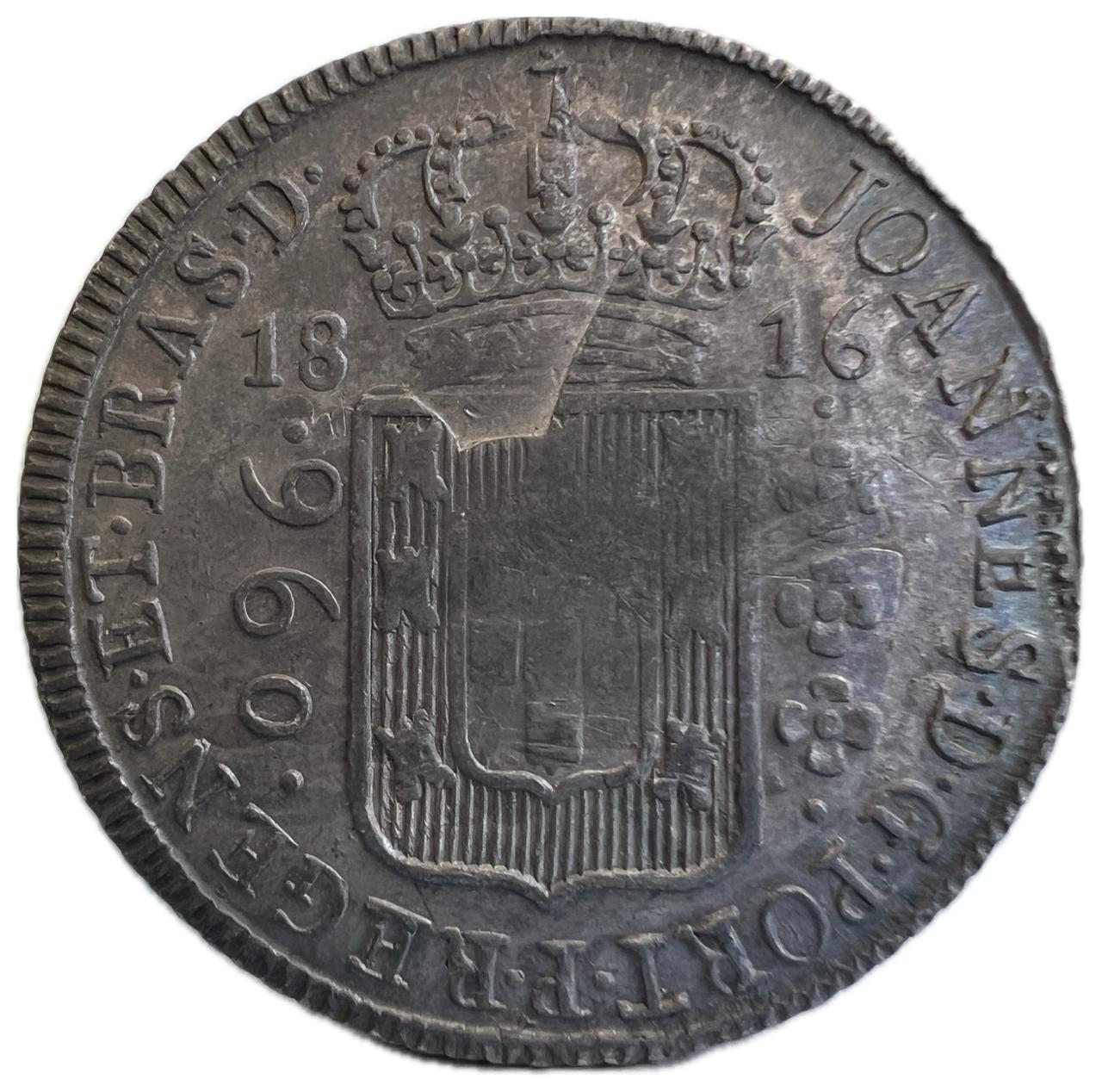 Anverso: JOANNES . D . G . PORT . P . REGENS . ET . BRAS . D . Escudo encimado por coroa, ladeado à esquerda por valor entre pontos e à direita 3 florões verticais entre pontos; data