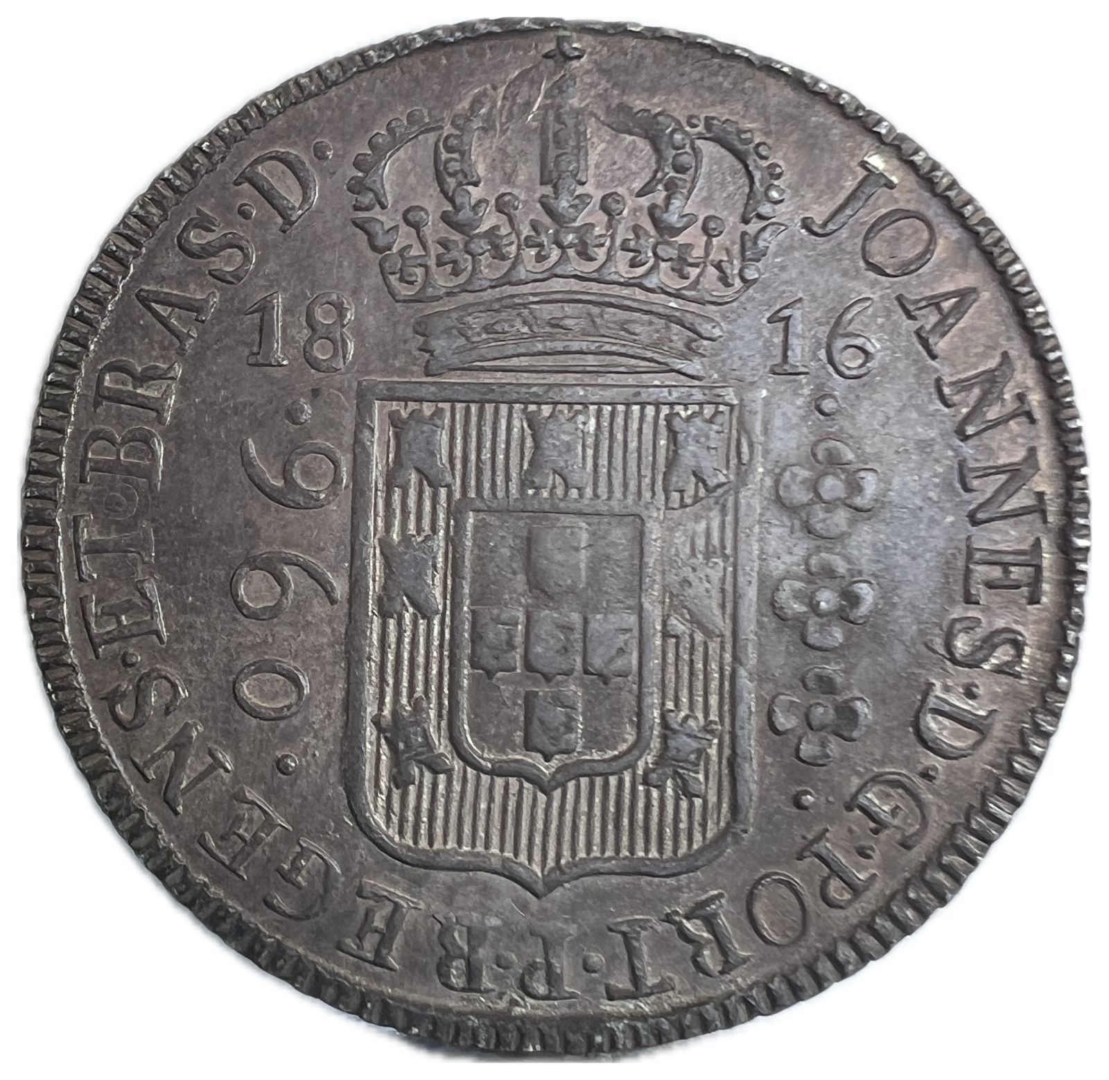 Anverso: JOANNES . D . G . PORT . P . REGENS . ET . BRAS . D . Escudo encimado por coroa, ladeado à esquerda por valor entre pontos e à direita 3 florões verticais entre pontos; data