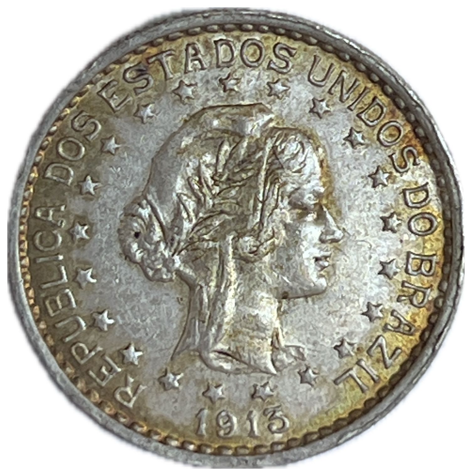 Anverso: REPUBLICA DOS ESTADOS UNIDOS DO BRAZIL (com Z) / Efígie da República circundada por círculo de 21 estrelas, não ligadas, representando a união dos Estados / No exergo, a data