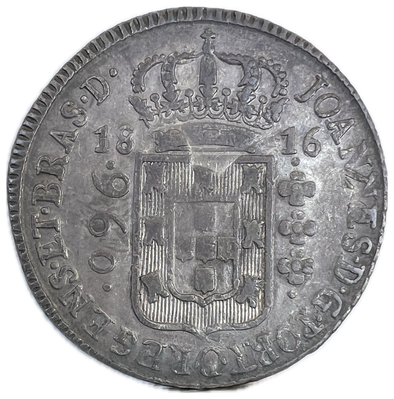 Anverso: JOANNES . D . G . PORT . P . REGENS . ET . BRAS . D . Escudo encimado por coroa, ladeado à esquerda por valor entre pontos e à direita 3 florões verticais entre pontos; data