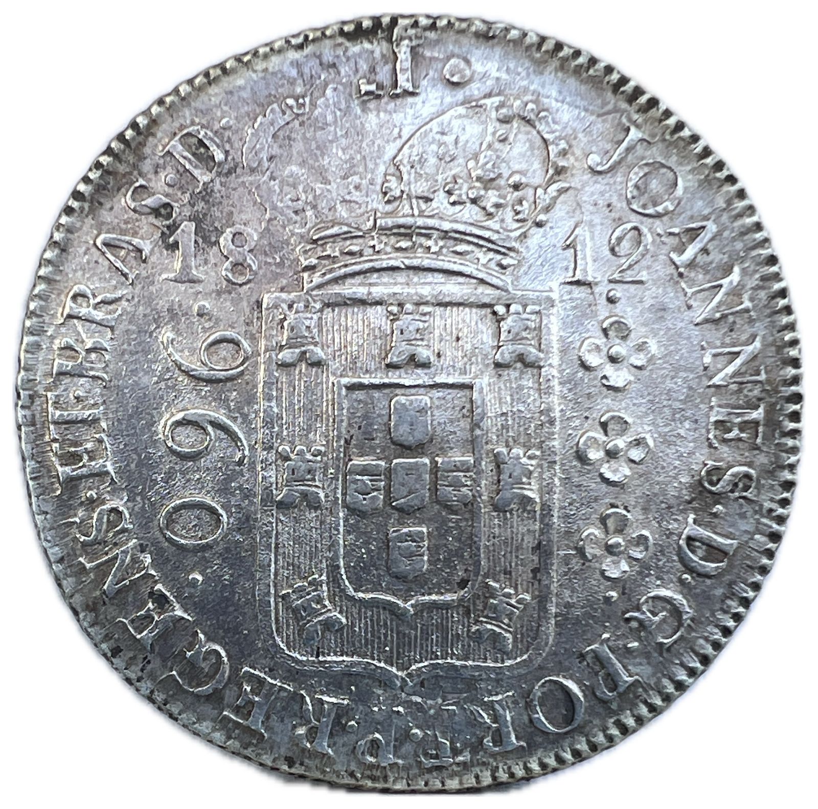 Anverso: JOANNES . D . G . PORT . P . REGENS . ET . BRAS . D . Escudo encimado por coroa, ladeado à esquerda por valor entre pontos e à direita 3 florões verticais entre pontos; data