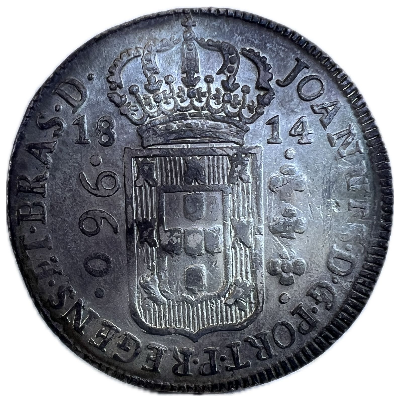 Anverso: JOANNES . D . G . PORT . P . REGENS . ET . BRAS . D . Escudo encimado por coroa, ladeado à esquerda por valor entre pontos e à direita 3 florões verticais entre pontos; data