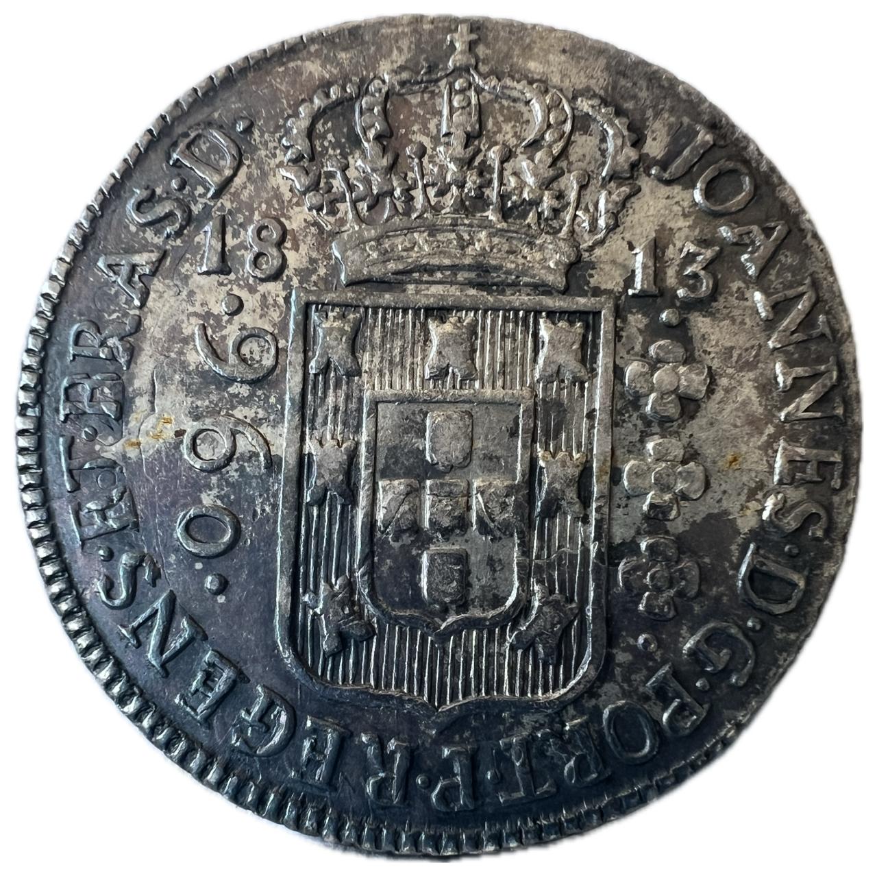 Anverso: JOANNES . D . G . PORT . P . REGENS . ET . BRAS . D . Escudo encimado por coroa, ladeado à esquerda por valor entre pontos e à direita 3 florões verticais entre pontos; data