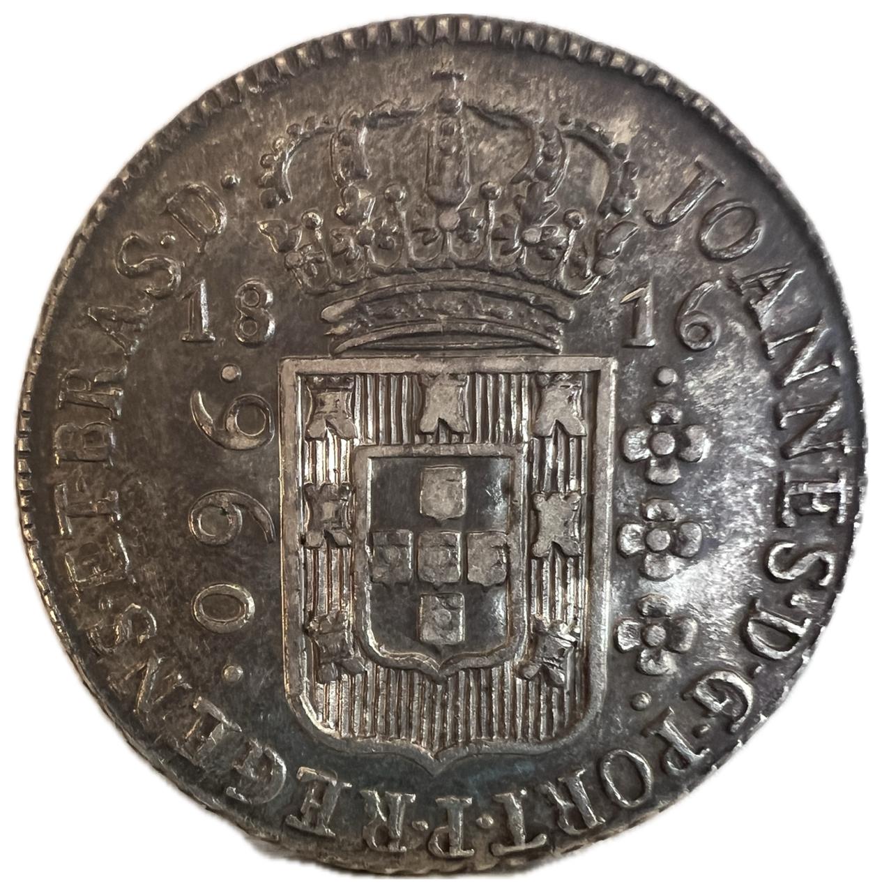 Anverso: JOANNES . D . G . PORT . P . REGENS . ET . BRAS . D . Escudo encimado por coroa, ladeado à esquerda por valor entre pontos e à direita 3 florões verticais entre pontos; data