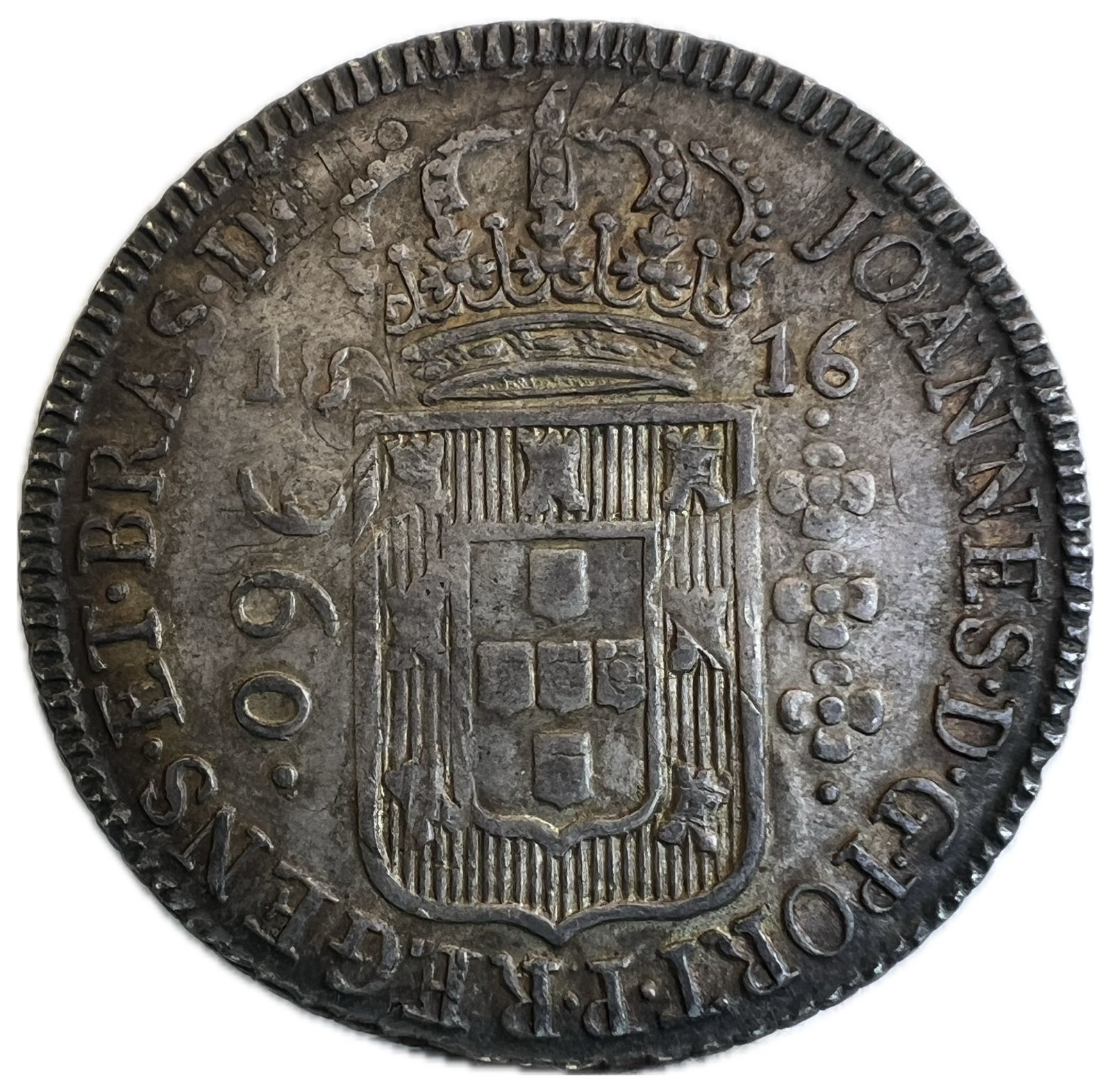 Anverso: JOANNES . D . G . PORT . P . REGENS . ET . BRAS . D . Escudo encimado por coroa, ladeado à esquerda por valor entre pontos e à direita 3 florões verticais entre pontos; data