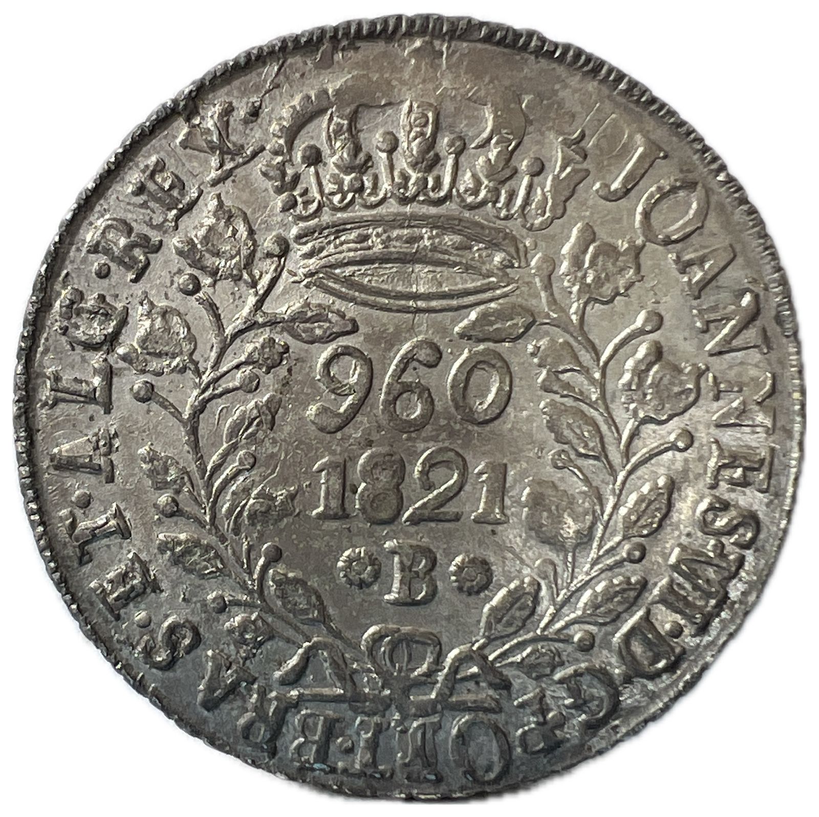 Anverso: JOANNES.VI.D.G.PORT.BRAS.ET.ALG.REX. Valor sobre data e letra R entre florões, ladeados por dois ramos de café e coroa