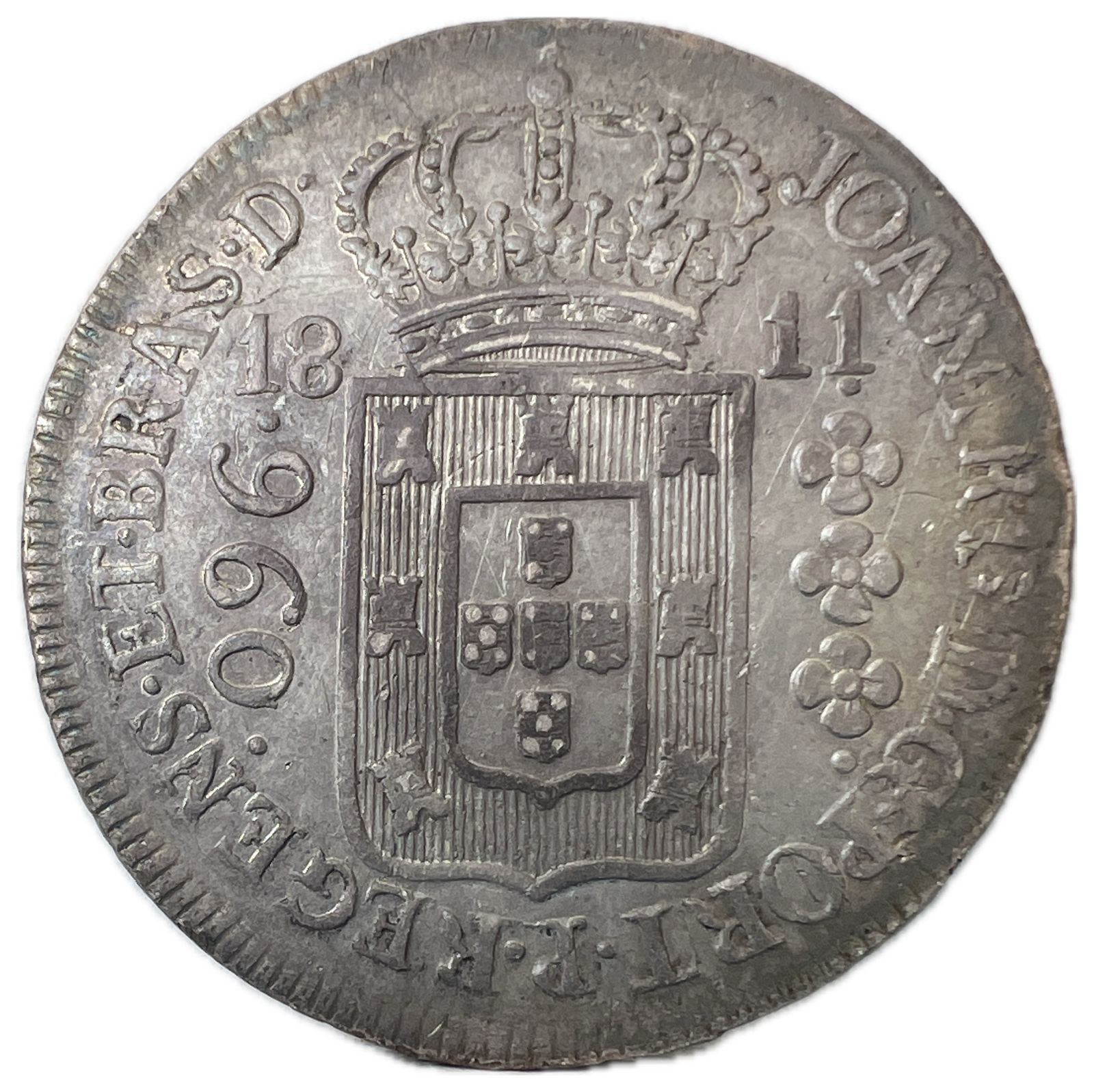 Anverso: JOANNES . D . G . PORT . P . REGENS . ET . BRAS . D . Escudo encimado por coroa, ladeado à esquerda por valor entre pontos e à direita 3 florões verticais entre pontos; data