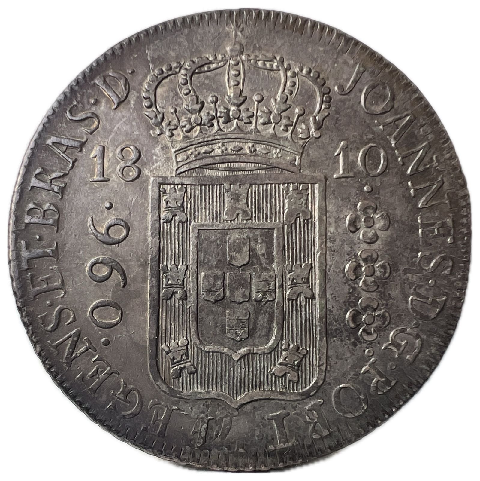 Anverso: JOANNES . D . G . PORT . P . REGENS . ET . BRAS . D . Escudo encimado por coroa, ladeado à esquerda por valor entre pontos e à direita 3 florões verticais entre pontos; data